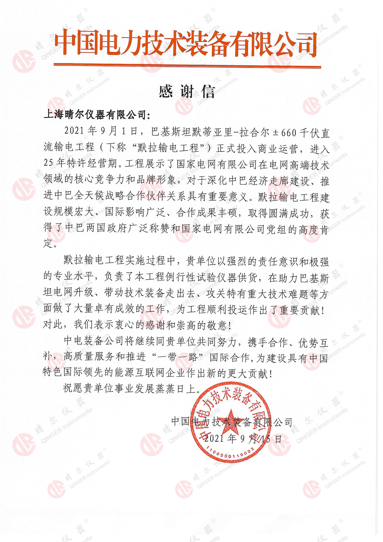 公司主要服务于国家电网,16年来累计向国家电网销售各类测试仪器万余套,在 “一带一路”巴基斯坦“默拉输电工程”中,以强烈的责任意识和极强的专业水平完成了例行性试验仪器供货,收到了国家电网中国电力技术装备有限公司的感谢信。